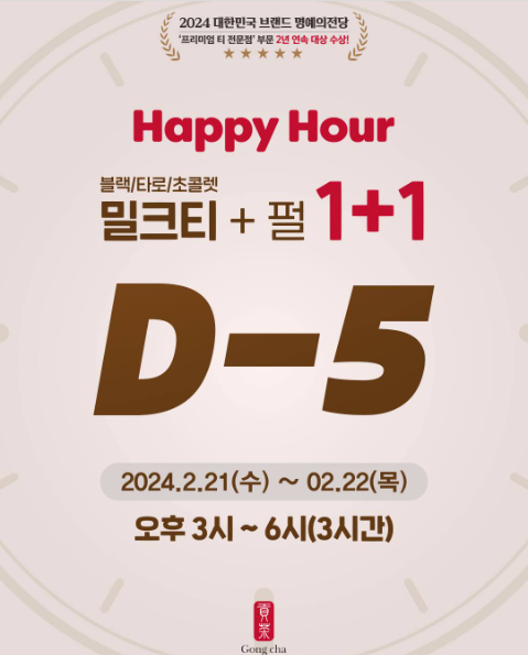대표 밀크티 브랜드인 공차가 2024 대한민국 브랜드 명의의 전당 '프리미엄 티 전문전' 부문 대상 수상을 기념하여 해피아워 이벤트를 진행합니다.