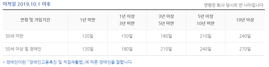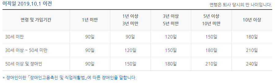 (이직일이 2019.10.1 이전은 퇴적 전 평균임금의 50% X 소정급여일수)