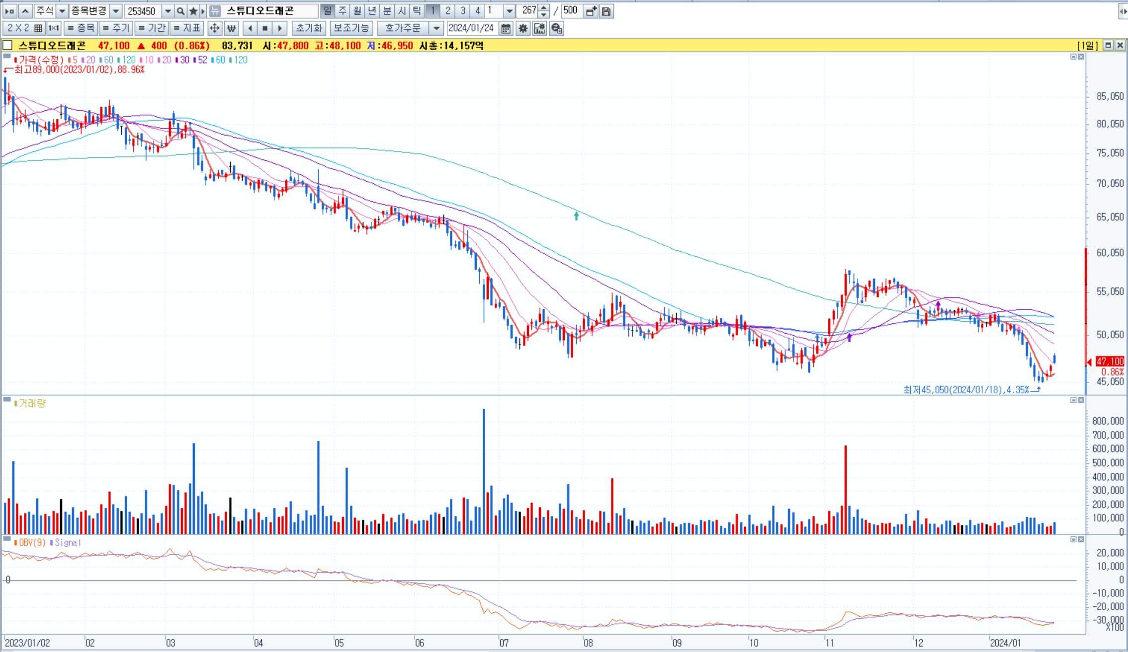 스튜디오드래곤은 국내를 대표하는 드라마 콘텐츠 제작업체입니다. 주요 제품으로 드라마 콘텐츠를 기획 및 제작하여 방송국과 미디어 플랫폼, 해외시장에 공급하고 관련 부가사업을 영위하는 방송영상물제작사업을 주 사업으로 하고 있습니다. 그중 드라마 판매가 2023년 3분기 전체 매출 비중에서 약 78%를 차지하고 있습니다. 주요 작품으로는 '나의 아저씨', '미스터 션샤인', '사랑의 불시착', '호텔 델루나', '빈센조' 등이 있으며 전 세계적으로 인기를 끌었던 '더글로리'도 스튜디오 드래곤의 작품입니다. 대표작들의 흥행에 비해 최근 주가의 흐름은 다른 콘텐츠 관련주와 동일하기 좋지 않은 모습을 보이고 있습니다.