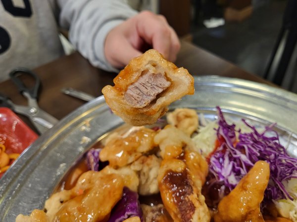 다음은 탕수육 소자 입니다. 탕수육 소자의 가격은 16,000원으로 다른 중국집과 가격이 비슷합니다. 하지만 음식을 받아보면 가격에 비해 양이 엄청 많다는 것을 알 수 있습니다. 양만 많은 것이 아니라 탕수육을 잘라보면 튀김옷 안에 돼지고기가 두툼하게 들어가 있어 양과 질 모두 만족할 수 있습니다. 소스는 케첩이 많이 들어간 옛날 탕수육 느낌이라 오랜만에 먹는 반가운 추억의 맛이었습니다. 탕수육을 주문할 때 따로 말하지 않으면 소스가 부어져서 나오니 찍먹이 취향인 분들은 주문할 때 소스를 따로 달라고 요청하시면 됩니다.