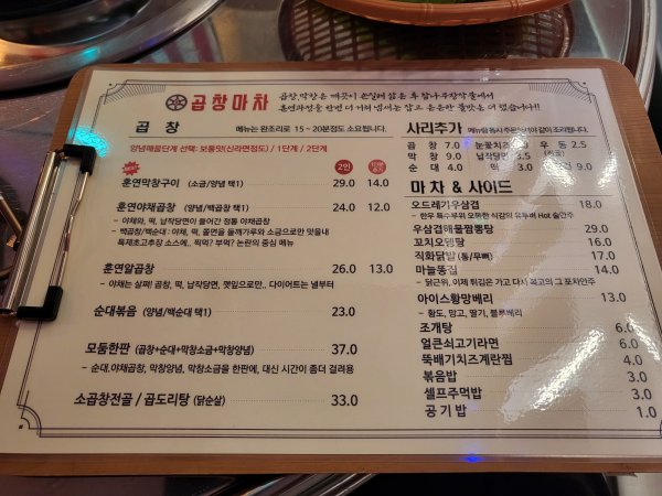 곱창마차는 야채곱창 전문점입니다. 대표메뉴로는 훈연막창구이와 훈연야채곱창이 있으며 소금과 양념 중 하나를 탣ㄱ할 수 있습니다. 그 외에도 훈연알곱창, 순대볶음이 있고 이 모든 음식을 함께 먹을 수 있는 모둠한판도 있습니다. 그리고 소곱창전골, 곱도리탕과 같은 전골메뉴도 있습니다. 곱창류 외에도 포장마차에서 즐길 수 있는 꼬치어묵탕, 직화닭발, 마늘똥집과 같은 다양한 메뉴들이 있습니다.