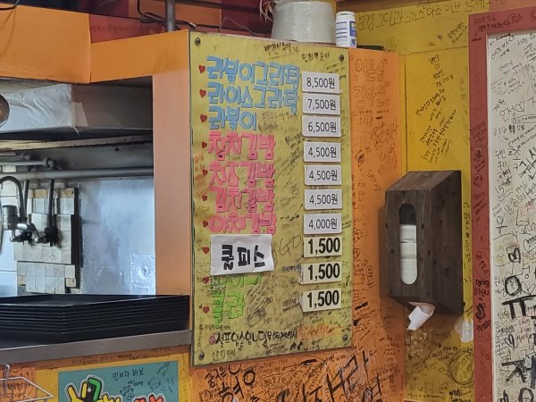 복층구조로 되어 있는 디델리는 오래된 가게인 만큼 많은 사람들이 다녀간 흔적이 가게 곳곳에 남아 있습니다. 특히나 여학생들한테 인기가 많았던 것으로 생각되어 집니다. 가게 내부 벽면 전체를 낙서로 빼곡하게 채워져 있어 낙서를 더 하고 싶어도 자리가 없어서 못할 정도입니다. 학창 시절 추억이 떠오르는 가게 내부입니다. 성인이 되어서도 학창 시절에 먹던 분식이 그리울 때 방문하기 좋은 곳인 것 같습니다.