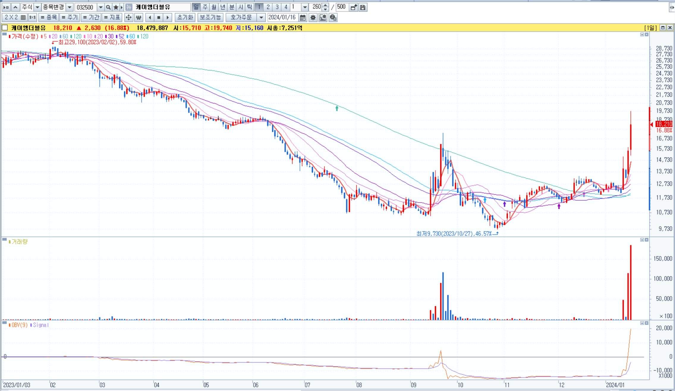 케이에더블유는 무선통신 기지국에 장착되는 각종 장비 및 부품류 등을 생산, 판매하는 RF사업과 스포츠 조명, 실외조명 등을 생산, 판매하는 LED 사업을 영위하고 있습니다. 2023년 3분기 기준으로 RF사업의 매출비중이 전체 매출의 약 84%를 차지하고 있습니다. 주요 거래처로는 라쿠텐, 후지쯔, 삼성전자 등이 있습니다. 과거 5G 관련주들이 시장을 주도할 때 대장주 역할을 했었기에 이번 6G 관련하여 통신장비 관련주가 상승흐름을 보일 때 역시 가장 큰 상승의 흐름을 보여주고 있습니다.