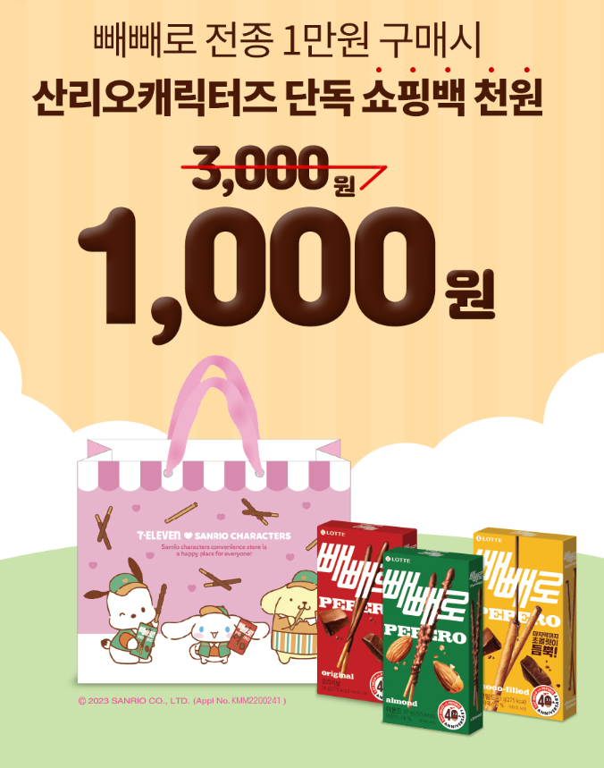 빼빼로데이 선물은 내용물도 중요하지만 내용물을 담는 포장 또한 중요합니다. 세븐일레븐에서 빼빼로 전 제품을 1만 원 이상 구매 시 요즘 가장 핫한 산리오캐릭터즈 단독 쇼핑백을 쇼핑백을 1,000원에 구매하실 수 있습니다.