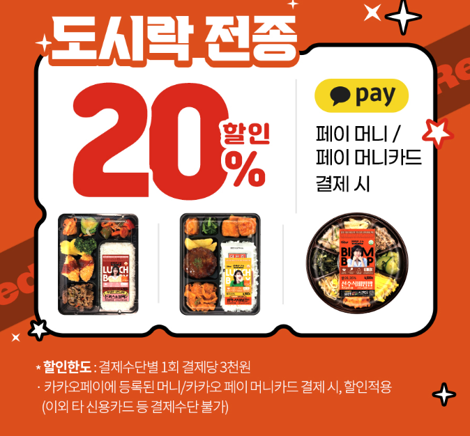 추워진 날씨에는 귀찮더라도 꼭 끼니를 챙겨먹어야 합니다. 밥 하기 귀찮거나 사 먹기도 싫을 때 맛있는 세븐일레븐 도시락을 카카오머니 or 카카오페이머니카드로 결제 시 20% 할인된 가격에 구매하실 수 있습니다.