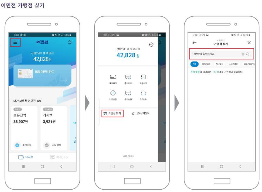 여민전 가맹점은 여민점 앱을 통해 찾으실 수 있습니다. 다만, 여민전 취급이 가능한 점포임에도 불구하고 아래의 아래의 사업장은 여민전으로 결제 되지 않으니, 결제 전 점포에 여민전 사용이 가능한지 확인핳여야 하며, 원치 않을 경우 결제 취소처리를 하시기 바랍니다.