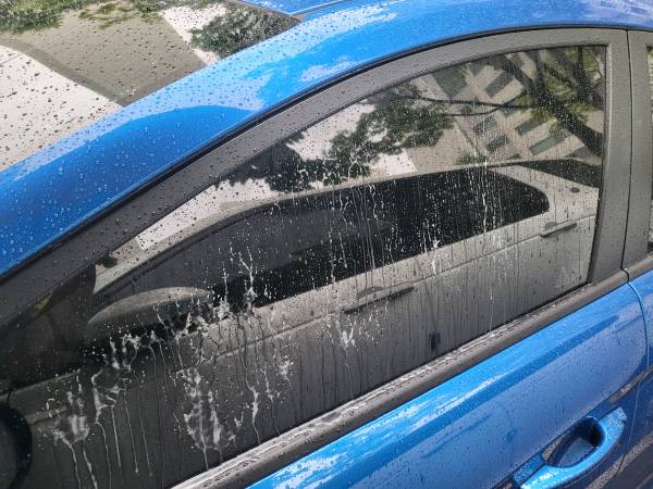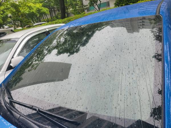 먼저 앞유리 입니다. 앞유리는 표면이 넓기 때문에 운전석과 조수석을 번갈아 가면서 작업을 해주었습니다. 배가 내리는 방향으로 앞유리가 향해 있어 발수코팅제 분사한 자국이 금세 사라졌습니다. 다른 부분을 작업하고 앞유리를 다시 보니 어느 정도 코팅이 되어 빗물이 이전보다 많이 튕겨져 나가는 것을 확인할 수 있습니다.
