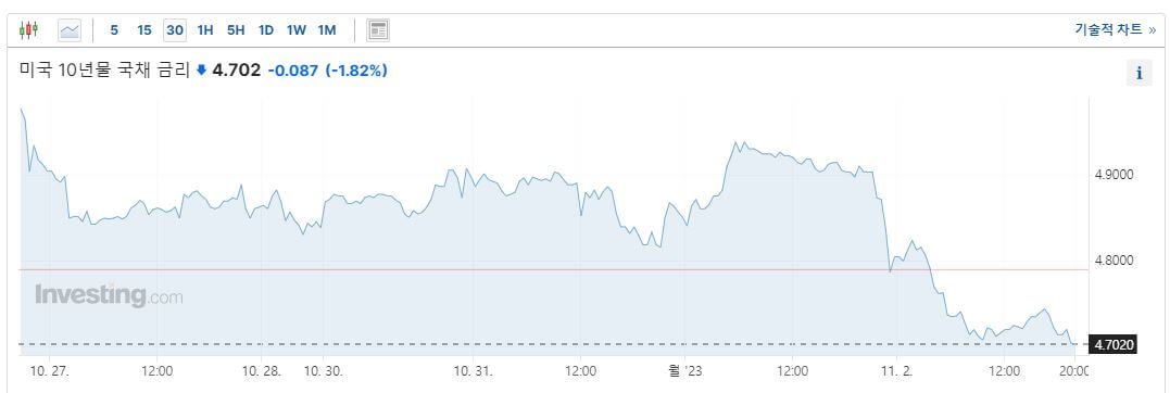 약속의 11월 어제에 이어 오늘도 국내증시는 상승하는 모습을 보였습니다. 특히나 최근 증시의 반등에 불확실 요소 중 하나였던 FOMC회의 결과 금리는 예상에 부합한 동결로 결정이 되었습니다. 하지만 중요했던 것은 파월 연중 의장의 연설 내용이었습니다. 이전과 동일하게 교과서적인 매파적 발언을 이어가지 않을까 하는 예측이 많았지만 의외로 비둘기적 발언을 하면서 뉴욕증시는 상승하며 마감을 하였습니다. 미국 10년물 국채금리 또한 현 시간 계속해서 하락하며 4,700선을 무너트릴 기세입니다. 원달러 환율 역시 1,339원으로 1,4000원 대 이하로 내려온 모습입니다.