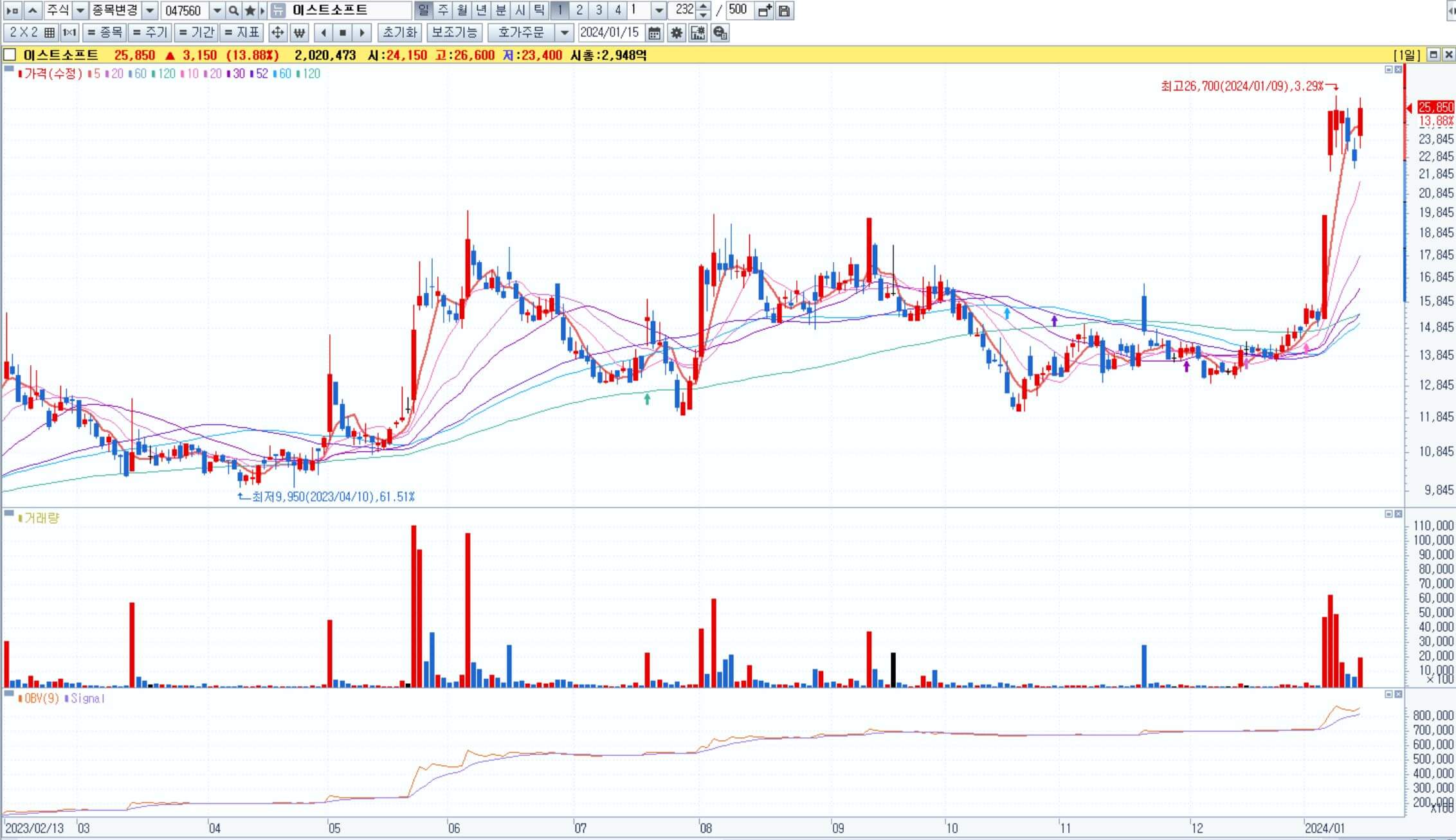 이스트소프트는 지난 1월 5일과 1월 8일 2 거래일 연속 상한가를 기록하였습니다. CES 2024에서 AI가 2024년의 화두로 떠오르고 오픈AI의 챗GPT스토어에 대한 출시로 인해 국내증시에서 AI 관련주가 주도를 할 때 가장 큰 주가상승 흐름을 보여주었습니다. 오늘 역시 14%대의 상승흐름을 이어가며 AI관련주의 대장주로 부각되는 모습입니다.