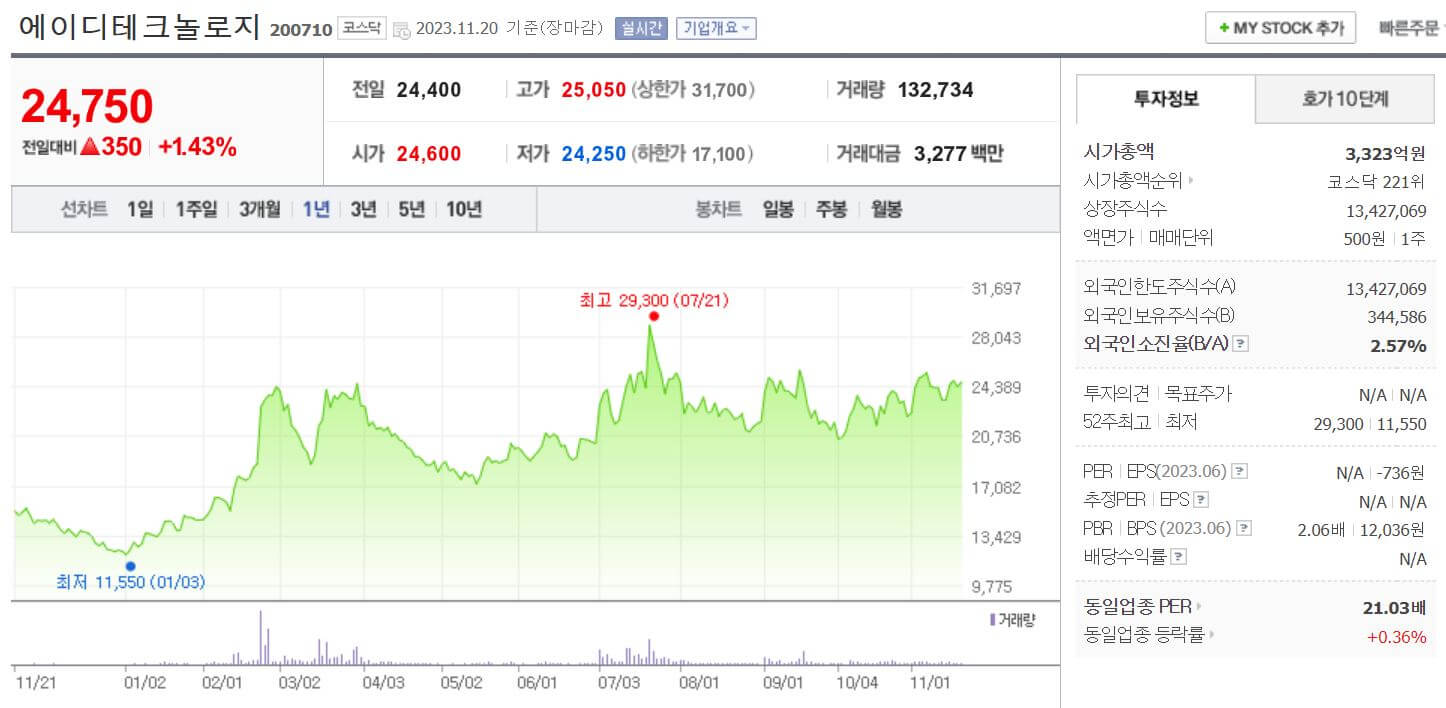 2023년 11월 20일 종가기준으로 주가는 24,750원, 시가총액은 3,323억원이고, 2023년 101% 상승을 보였습니다. 과거 TSMC생태계에서 삼성 파운드리로 넘어오면서 힘든 시절을 보냈지만 국내 반도체 기업으로는 유일하게 지난 10월 Arm의 토털 디자인 파트로 선정되었습니다. 또한 같은 달 삼성 파운드리의 3나노미터 공정 기반의 설계 지원 사업의 수주함으로 앞으로 실정 성장의 기대감을 높이고 있습니다. 에이디테크놀로지의 강점으로는 대규모 프로젝트 경험과 삼성전자 파운드리사업부의 DSP 중 가장 큰 매출규모와 설계 인력 및 인프라룰 보유하고 있다는 점입니다.