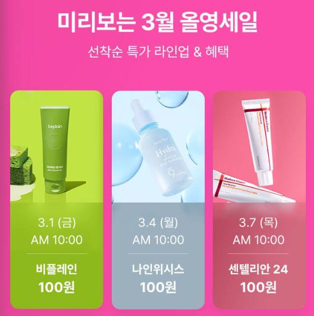 - 선착순 특가 : 행사 시작 첫날인 3월 1일을 포함해 3일 동안 매일 한 가지 상품을 100원에 판매하는 행사입니다. 전국 매장에서 재고 소진 시까지 진행되며 1만 원 이상 구매한 고객에 한해 행사가 진행되며, 온라인과 모바일 앱에서는 구매금액 제한 없이 오전 10시에 행사 상품을 선보인다고 합니다.