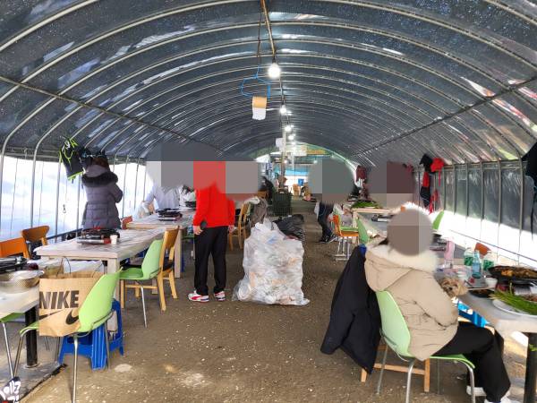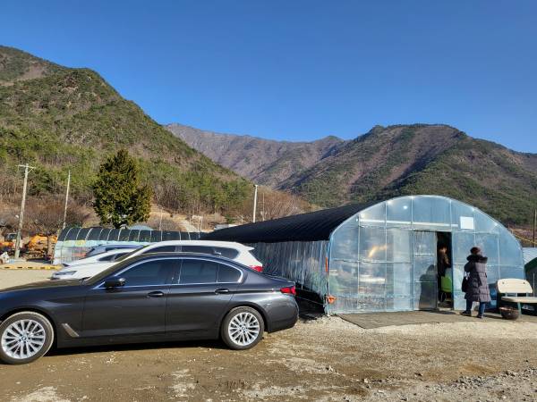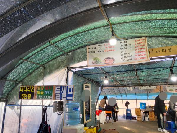 원동 청정 미나리 삼겹살은 원동면 일대 이곳저곳에서 판매를 하고 있습니다. 하지만 원동 미나리 삼겹살 상징하는 곳은 숫자로 표시되어 있는 가게들입니다. 가게의 형태는 비닐하우스로 된 곳도 있고 일반 식당건물처럼 된 곳이 있습니다. 원동 청정 미나리축제가 개최되는 곳을 따라가면 길가에 크게 숫자로 표시된 가게들을 쉽게 찾을 수 있습니다. 이번에 방문한 곳은 15번 집입니다. 15번집을 선택한 이유는 이곳에서 제공되는 김치는 다른 가게와 다르게 직접 담근 김치가 제공되기 때문입니다. 15번집은 아래 사진처럼 비닐하우스로 되어 있습니다.