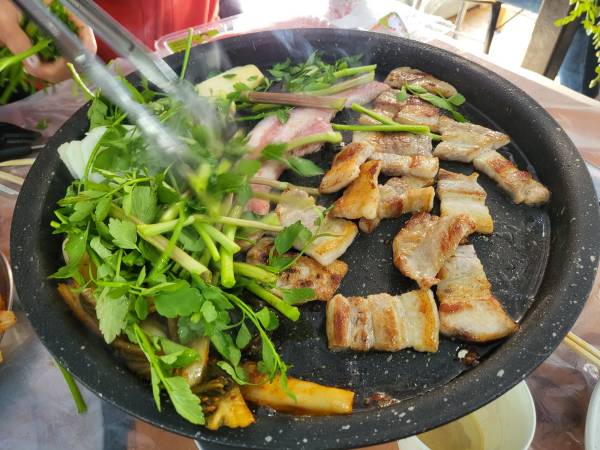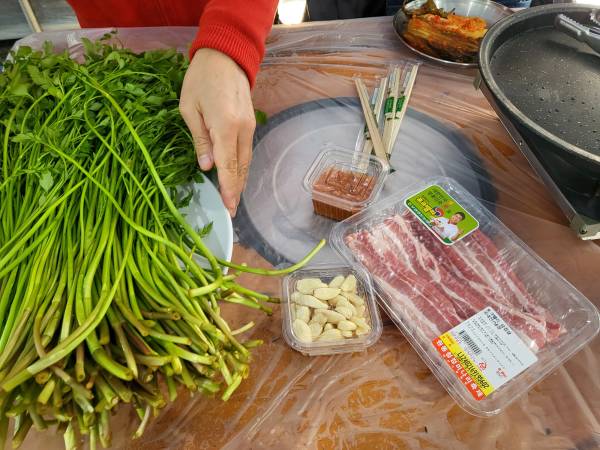 원동 미나리 삼겹살집의 시스템은 삼겹살을 직접 가지고 오면 자리대여비 20,000원이 부과되고 가게에서 삼겹살을 주문해서 먹을 경우 자리대여료는 무료입니다. 그 외 쌈장, 김치, 마늘, 햇반 등은 모두 유료입니다. 이곳의 장점은 가게에서 판매되고 있는 음식이 아니면 직접 가지고 와서 먹을 수 있다는 점입니다.