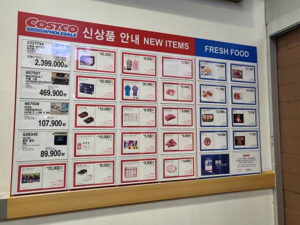 코스트코 주차장에 주차를 하고 매장으로 내려가면 1층에 신상품 안내 게시물을 볼 수 있습니다. 코스트코 양재점은 1층 매장에는 전기/전자, 자동차 용품, 의류/잡화, 사무용품, 건강/미용, 가정용품 등 식품류를 제외한 상품들이 판매되고 있습니다. 코스트코에서 인기가 많은 식품매장은 지하 1층에 위치하고 있습니다. 지하 1층으로 가는 길에 이런 상품들을 배치함으로써 쇼핑객들이 코스트코의 전체 상품을 볼 수 있도록 동선을 짜 놓은 것으로 보입니다.