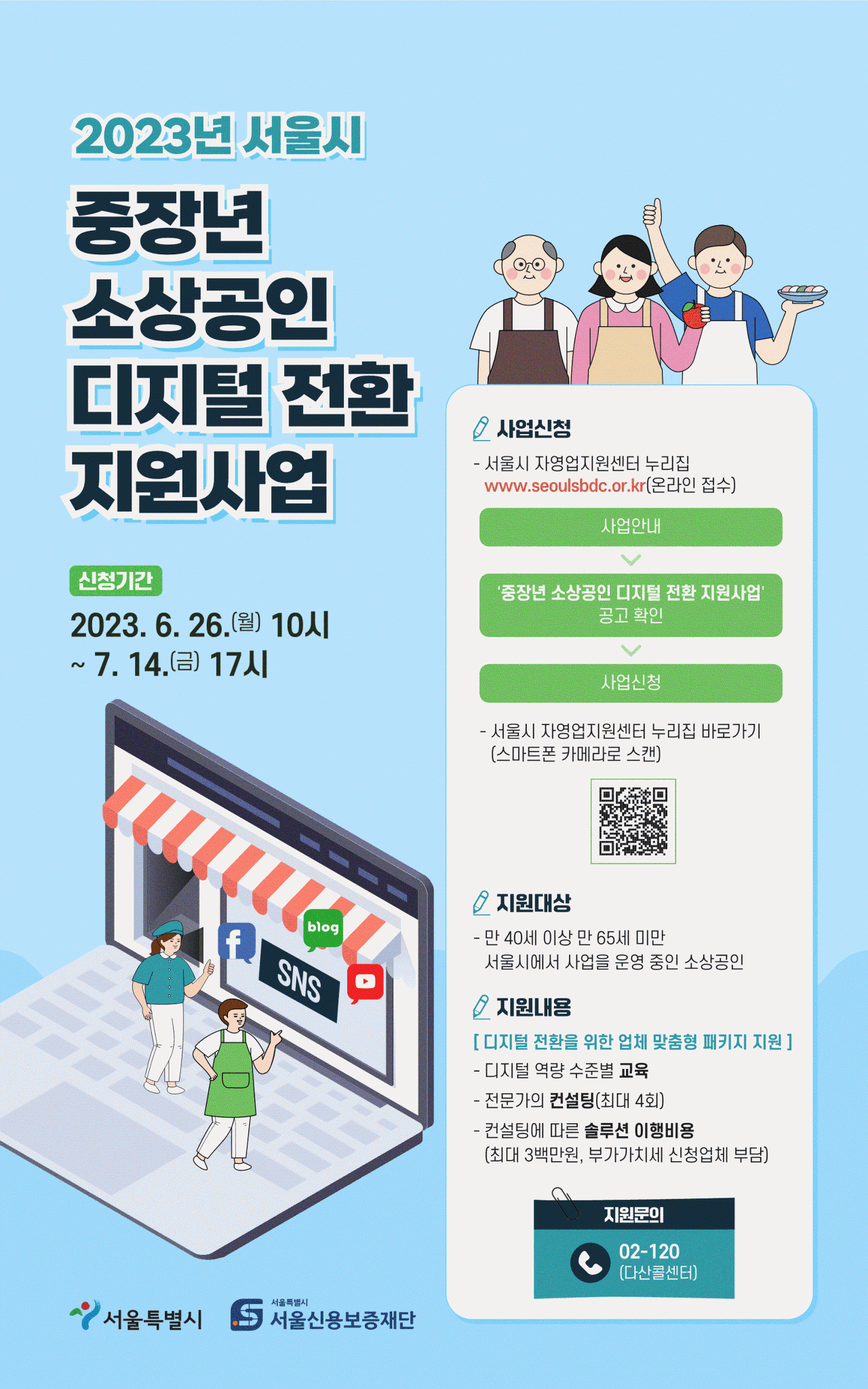 소상공인이 디지털 스마트 기술을 활용하여 배달앱 입점, 스마트스토어 입점, 오픈마켓 입점 등 공급자 및 고객과의 거래활동과 생산 및 운영 등의 활동에서 편의성, 효율성, 생산성 등을 높이는 환경 구축을 지원하기 위해 서울시에서는 중장년층 소상공인을 위한 디지털 전환 지원사업 대상자를 모집하고 있습니다.