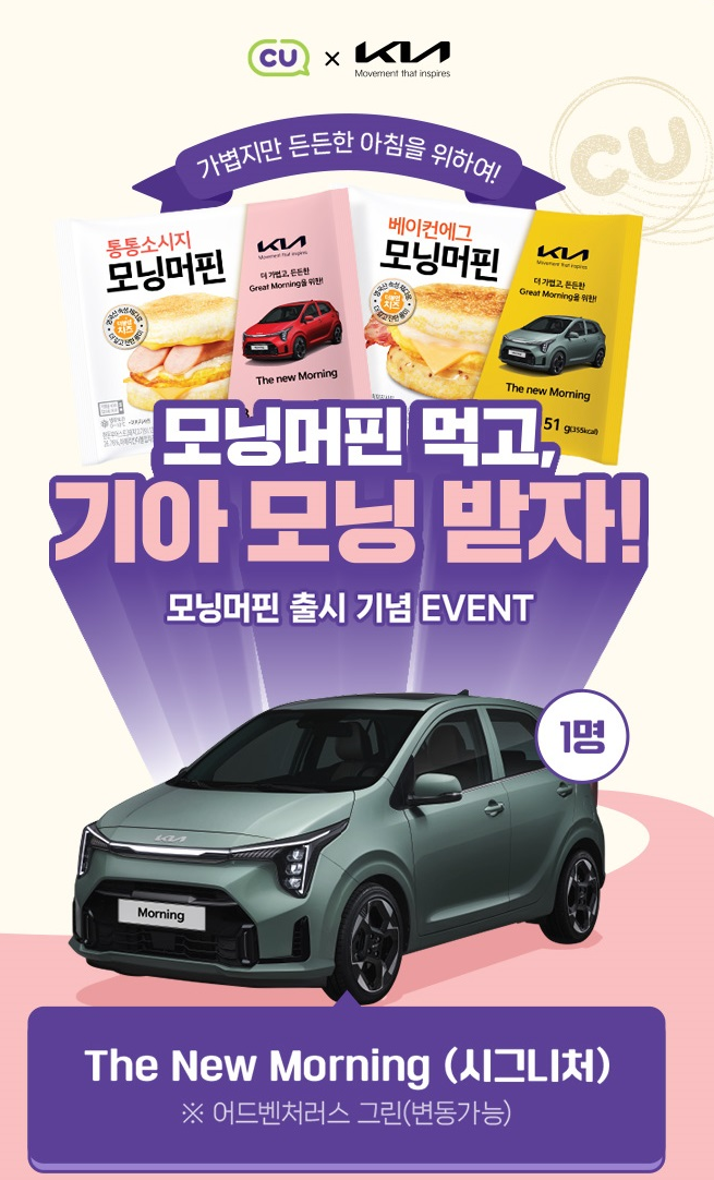 CU편의점에서 판매하는 모닝머핀 먹고 KIA 모닝을 받을 수 있는 기회가 주어집니다. 모닝머핀 출시기념 EVENT이니 맛있는 머핀 드시고 꼭 참여하시기 바랍니다.