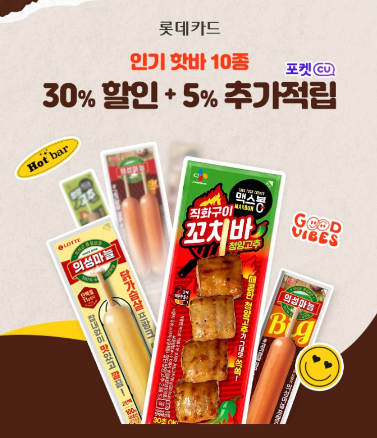 아이들 간식으로도 좋고 숭란주로도 좋은 맛있는 핫바 10종을 롯데카드로 결제하시고 30% 할인 받으시기 바랍니다.