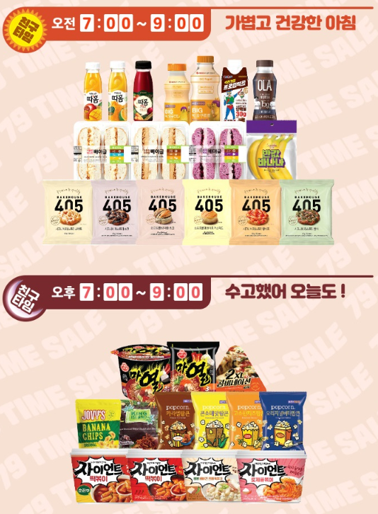 BC카드와 KB국민카드로 결제 시 하루 두번 오전 7시 ~ 9시, 오후 7시 ~ 9시 타임할인을 통해 다양한 상품을 저렴한 가격에 즐길 수 있습니다.