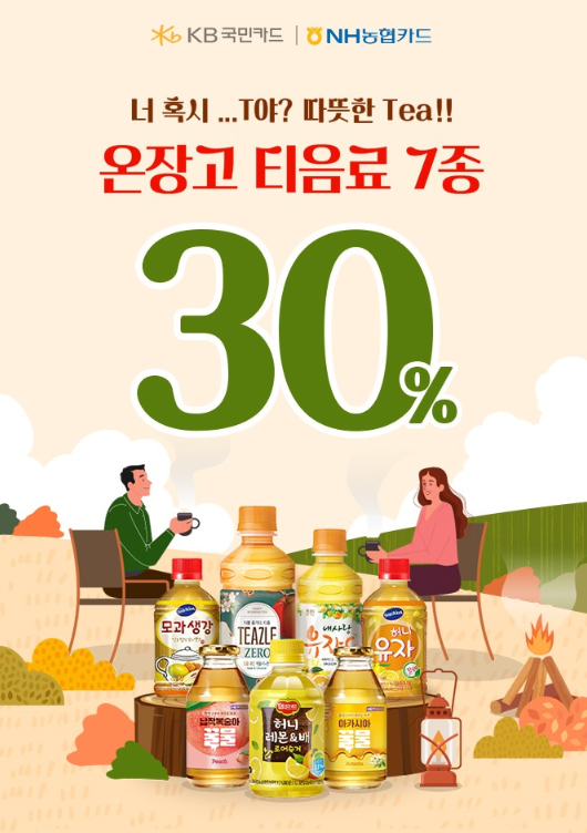 아이스의 계절은 가고 드디어 온장고의 계절이 돌아왔습니다. 쌀쌀해진 날씨에 어울리는 티 음료 상품들은 KB국민카드와 NH농협카드로 결제하시고 30% 할인혜택 받아보시기 바랍니다.