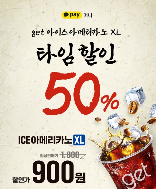 얼죽아들에게 쌀쌀한 날씨는 아무런 문제가 되지 않습니다. 오전 5시 ~ 10시 get커피 ICE아메리카노 XL를 카카오페이머니로 결제 시 50% 할인된 가격인 900원에 구매하실 수 있습니다.