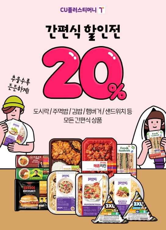 한 끼 식사대용으로 충분한 고퀄리티 CU 편의점의 간편식을 CU플러스티머니로 결제시 20% 할인된 가격에 구매하실 수 있습니다.