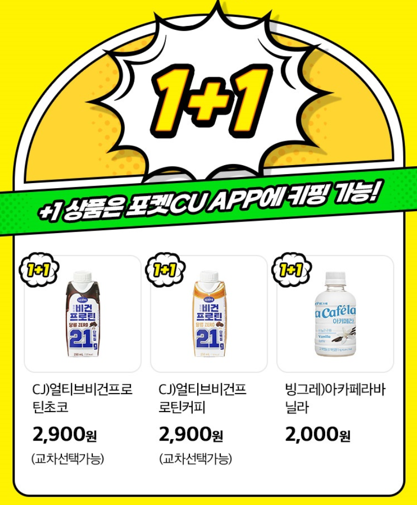 1+1원 행사 상품 중 +1 상품은 포켓CU APP에 키핑가능 합니다. 행사대상 상품은 CJ)얼티브비건프로틴초코, CJ얼티브비건프로틴커피, 빙그레)아카페라바닐라 입니다. CJ얼리브비건프로틴 2개의 상품은 교차 선택도 가능합니다.
