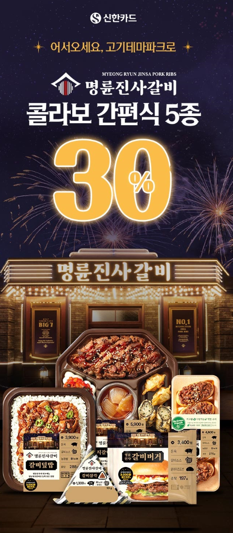 국내 대표 돼지갈비 브랜드인 명륜진사갈비와 CU가 만났습니다. 먼저 신한카드로 결제시 행사대상 상품인 간편식 5종을 30% 할인된 가격에 구매할 수 있습니다.