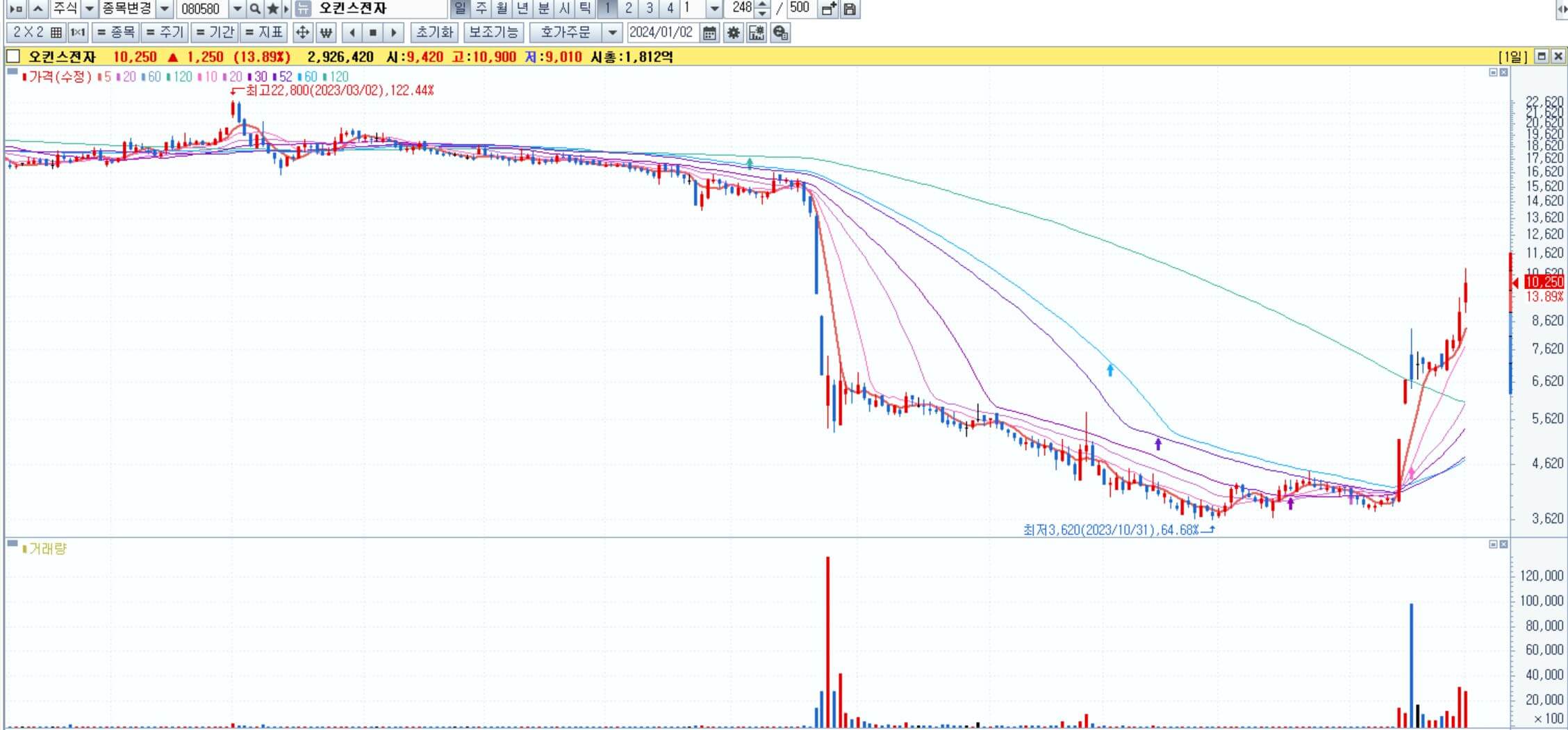 국내최초로 DDR5 메모리 인터페이스 개발을 완료했다는 점에서 서로 다른 인터페이스간의 연결하는 개념인 CXL의 관련주로 시장에서 부각되고 있습니다. DDR5는 CXL의 기반이 되는 메모리라 할 수 있습니다. 오킨스전자 역시 네오셈과 마찬가지로 CXL 관련주로 부각된 이후 큰 폭의 상승이 있었습니다. 12월 대비 오늘까지 100% 이상 상승을 하였습니다.