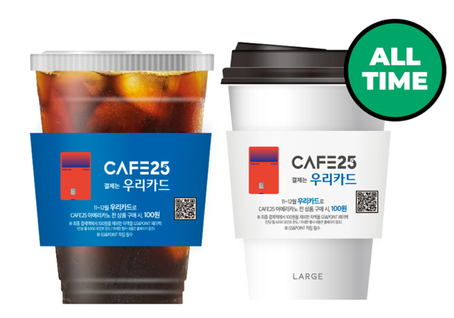 GS25에서 카페25 아메리카노 구입 시 GS&POINT를 적립하고 우리카드로 결제하면 카페25 아메리카노 전 상품을 100원에 구매할 수 있습니다. 최종 결제금액에서 100원을 제외한 차액은 페이백 될 예정이며 인당 월 4,000원이 한도입니다. 페이백은 GS&POINT로 '24년 1월에 일괄 페이백 될 예정입니다. 또한 통신사 및 우리동네GS클럽 카페25 구독 할인과 중복 적용 가능합니다. 이 경우는 할인 적용 후 최종 결제금액 기준으로 적용됩니다. 기업/선불/충전/기프트/하이브리드/카카오페이 등 간펼결제를 제외한 개인 신용/체크카드 결제에 한정됩니다.