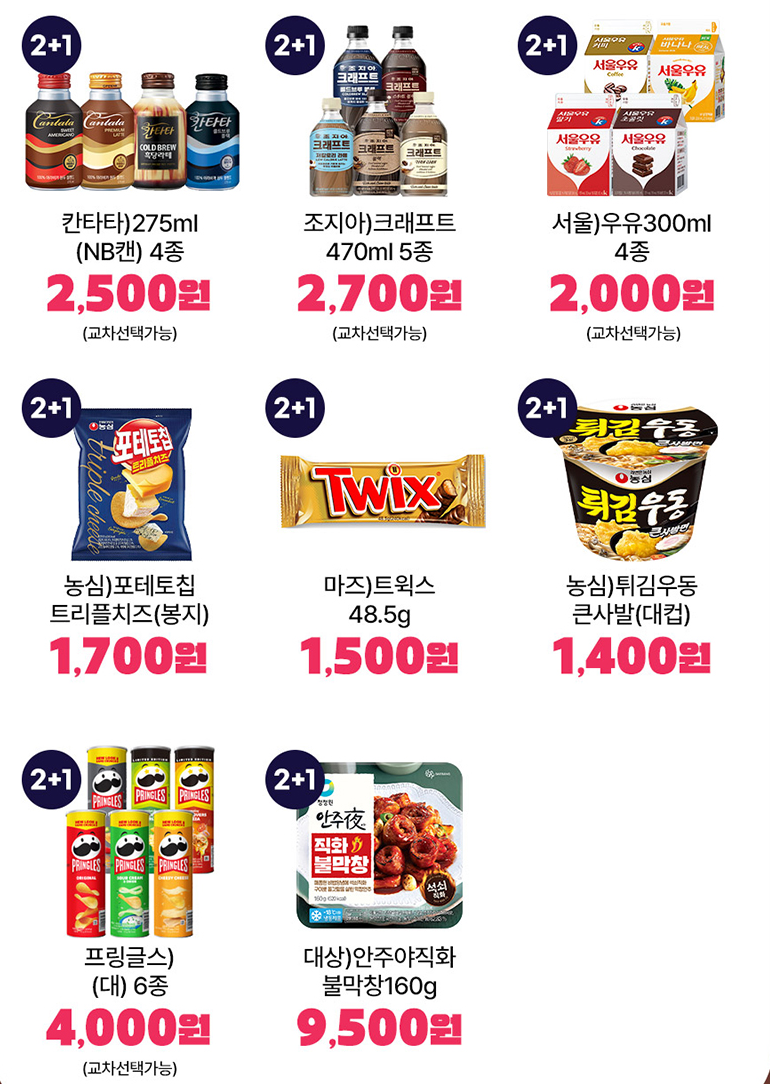 2월 GS25 편의점의 전문 MD추천상품은 1+1 행사 대상상품으로는 롯데)펩시제로라임캔355ml, HK)컨디션스틱(그린애플)이 있습니다. 2+1 행사 대상상품은 칸타타)275ml(NB캔) 4종, 조지아)크래프트470ml(5종), 서울)우유300ml(4종), 농심)포테토칩 트리플치즈(봉지), 마즈)트윅스48.5g, 농심)튀김우동 큰사발(대컵), 프링글스)대6종, 대상)안주야직화 불마강160g 등이 있습니다.