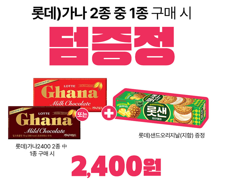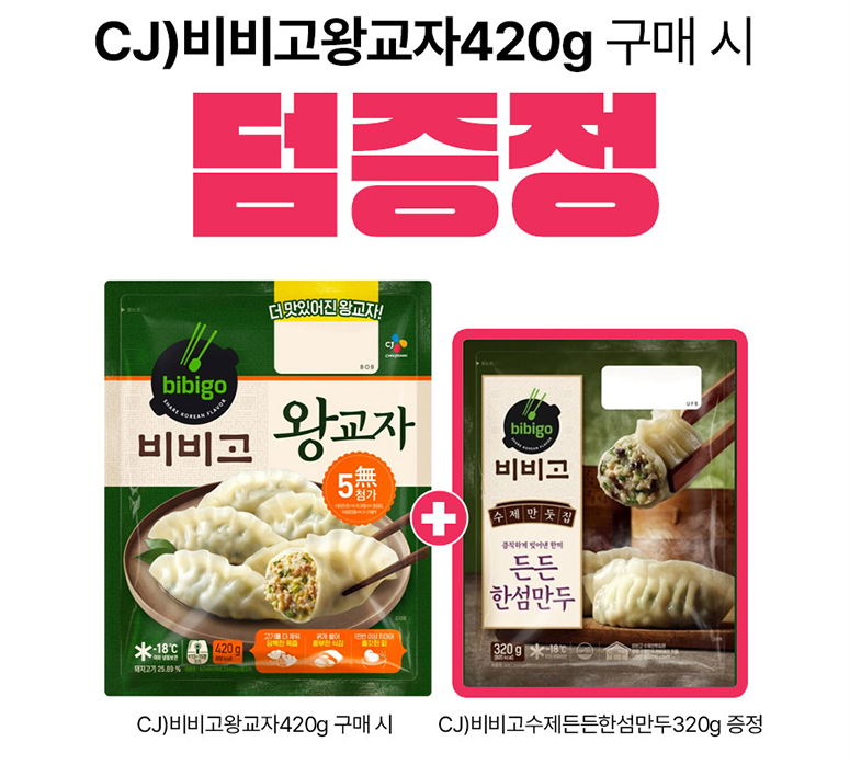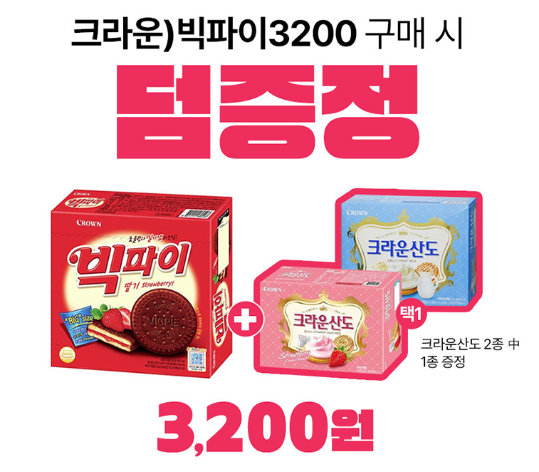 덤증정 행사 대상상품으로는 크라운)빅파이3200 구매시 크라운)산도(딸기)161g 또는 크라운)산도(크림)161g 중 1종을 증정하고 있습니다. 롯데)가나마일드2400 또는 롯데)가나밀크2400 2종 중 1종 구매시 롯데)샌드오리지날(지함)을 증정하고 있습니다. 마지막으로 CJ)비비고왕교자420g 구매 시 CJ)비비고수제든든한섬만두32g을 증정하고 있습니다.