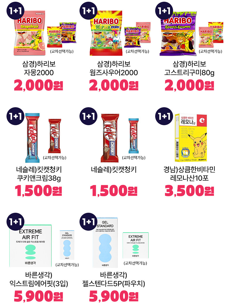 2월 1일 ~ 2월 16일 동안 1+1, 덤증정 행사를 진행하고 있습니다. 1+1 행사 상품은 삼경)하리보 자몽2000, 삼경)하리보 웜즈사우어2000, 삼경)하리보 고스트리구미 80g 있습니다. 하리보 행사 상품들은 교체 선택도 가능합니다. 네슬레)킷캣청키 쿠키앤크림 38g, 네슬레)킷캣청키도 1+1 행사 대상 상품으로 교차 선택이 가능합니다. 바른생각)익스트림에어핏(3입), 바른생각)젤스텐다드5P(파우치) 역시 1+1 행사 대상 상품으로 교차 선택이 가능합니다.