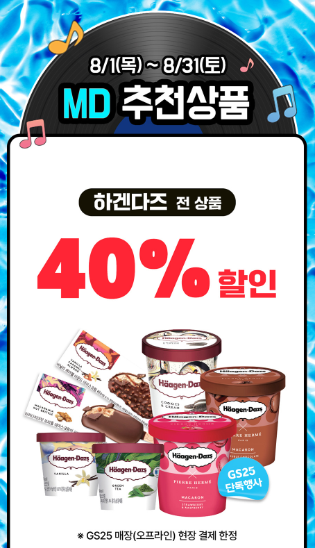 GS25의 전문적인 MD이 엄선한 추천상품을 8월 1일 ~ 8월 31일 한 달간 여러 가지 형태로 할인행사를 진행하고 있습니다. 할인 대상 상품은 다음과 같습니다.