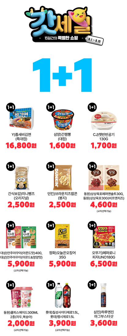 갓세일은 GS25에서 매달 진행되는 대표 할인행사 입니다. 8월 1일 ~ 8월 1일 단 15일간 진행되며 1+1, 6+6 행사가 준비되어 있습니다. 행사대상 상품은 다음과 같습니다.