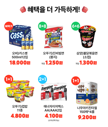 인기있는 라면 상품을 대상으로 행사를 진행하고 있습니다. 모두가 좋아하는 오뚜기 진비빔면(봉지) 8+8, 삼양 불닭볶음면(소컵) 6+6 저렴한 가격에 구매할수 있는 기회입니다. 또한 카스병 500ml 12입 상품을 18,000원에 구매할 수 있습니다 .