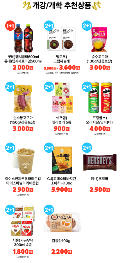 다양한 간식 상품들이 2+1 행사 대상 상품입니다. 클림까놀레, 순수고구마 130g, 순수통고구마, 150g, 젤리블리 5종, 프링글스 오리지날/양파(대) CAFE25 아이스진짜우유라떼큰컵/아이스바닐라라떼큰컵, 고메소바바치킨소이허니180g, 허쉬초코바, 서울우유300ml 4종, 감동란100g, 에너자이저맥스 AA/AAA2입 등이 있습니다.