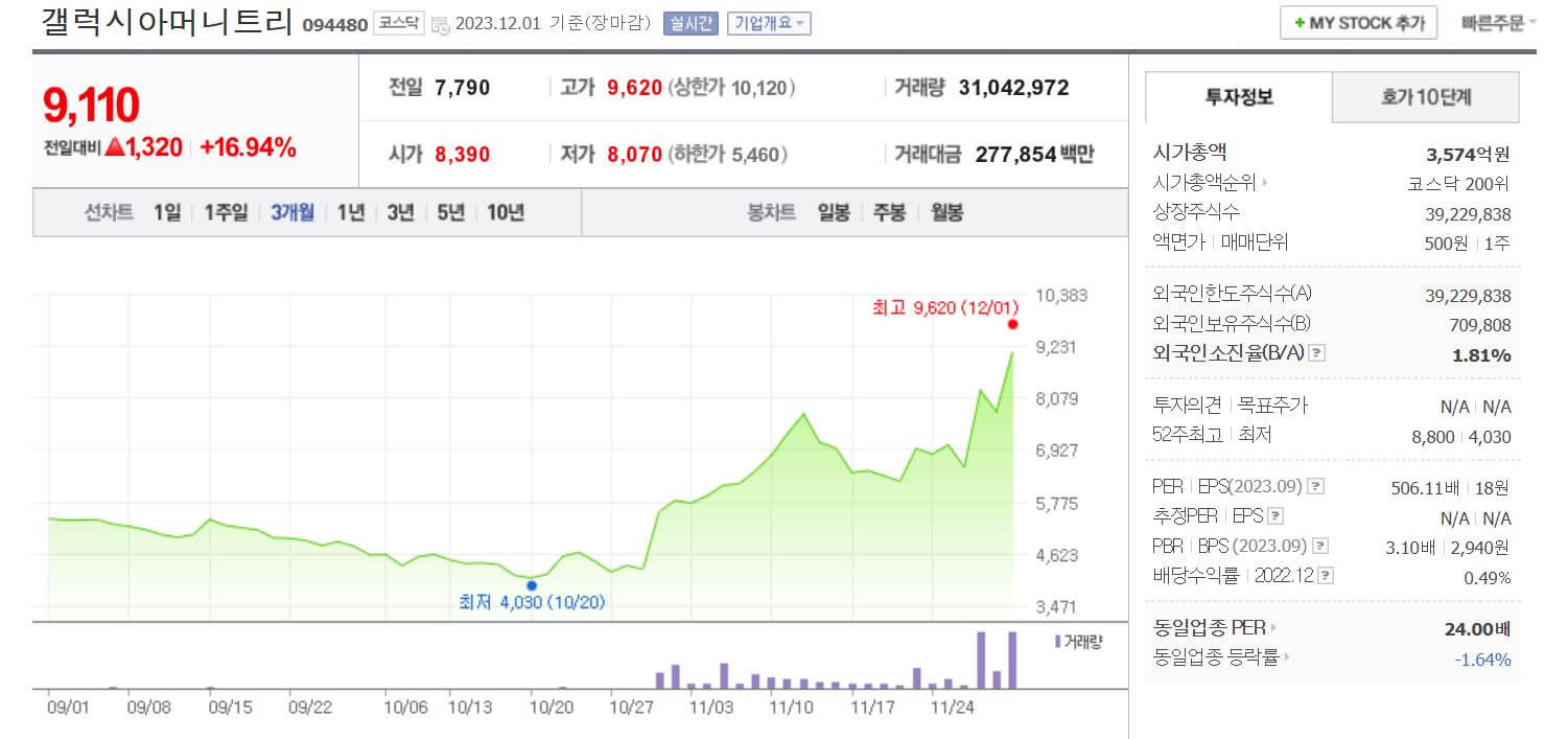 스포츠마케팅과 국내판권을 소유하여 운동기구 유통사업을 영위하고 있습니다. 갤럭시아에스엠은 11월 들어 강세흐름을 이어가다 29일 상한가를 기록하였습니다. 이는 귬융위원회 본회의에서 STO 장내 시범 개설 규제 샌드박스로 승인될 것이라는 점 때문인 것으로 풀이됩니다. 또한 STO관련 대장주로 분류되어 있는 갤럭시아머니트리를 자회사로 가지고 있습니다.